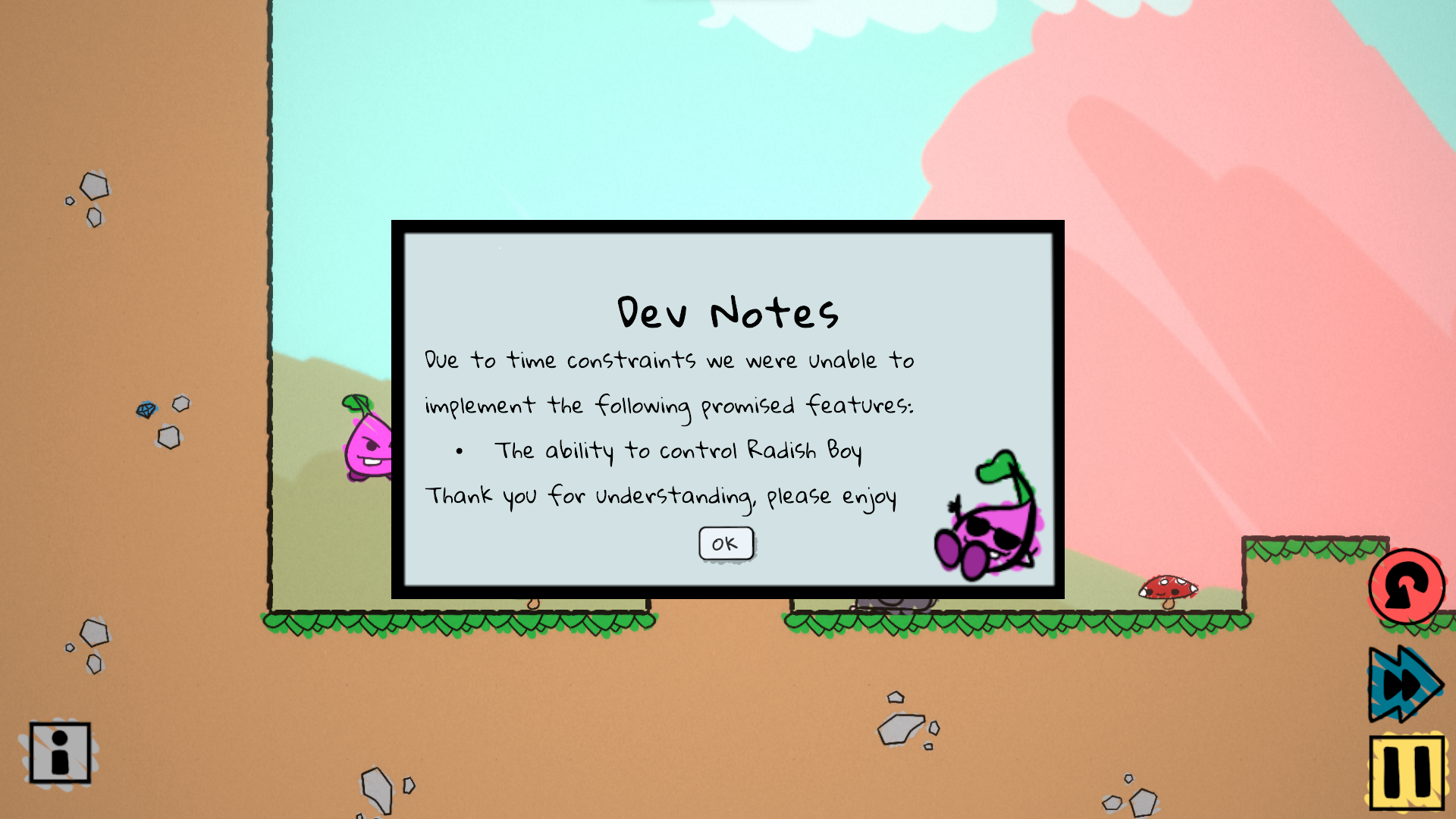 The Adventures of Radish Boy was a puzzle-platformer game some friends and I developed in less than 48 hours for the 2023 Game Maker’s Toolkit Game Jam. This was my first time working on such a project both collaboratively and under such a short timeframe. I learned a lot during these 48 hours about game development, effective collaboration, music composition, Unity Engine’s build system, and much, much, more. It was an absolute blast working with Joe Arch, Aidan Klein, Jacob Lee, John Schappert, Eleanor Taylor, and Randy Xu!